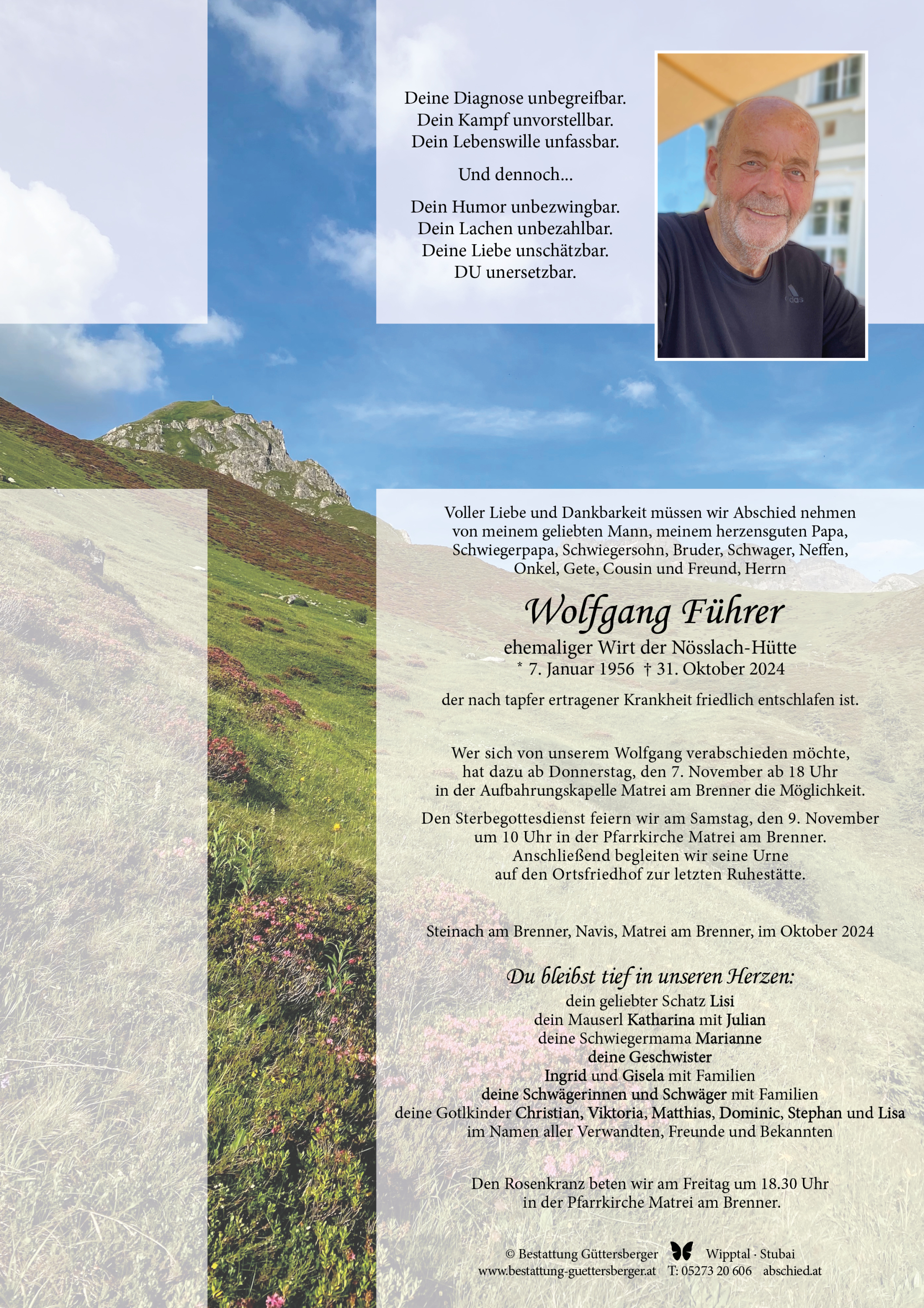Liebe Lisi, liebe Katharina! Es ist schwer, ja fast unmöglich in Augenblicken wie diesen, Trost auszusprechen. Dennoch möchten wir euch sagen, wie sehr wir mit euch fühlen. Ein Mensch, der uns auf unserem Lebensweg mit seiner Liebe begleitet hat, bleibt uns für immer nah. Ein Leben ohne den geliebten Menschen wird oft schwer sein. Es ist nicht leicht, die richtigen Worte zu finden. Wolfgang war ein sehr liebenswerter, netter Mensch. Wir erinnern uns sehr oft und gerne an die netten Rodelabende mit unserer damals noch kleinen Nina und eurer Katharina. Wir wurden kulinarisch verwöhnt und haben uns immer sehr gefreut, wenn wir uns begegnet sind. Wieder eine gute Seele weniger hier auf diesem Felsen……. Wir wünschen euch ganz viel Kraft in dieser schweren Zeit. Von Herzen mitfühlend Andrea, Romed und Nina 🖤🕯🖤