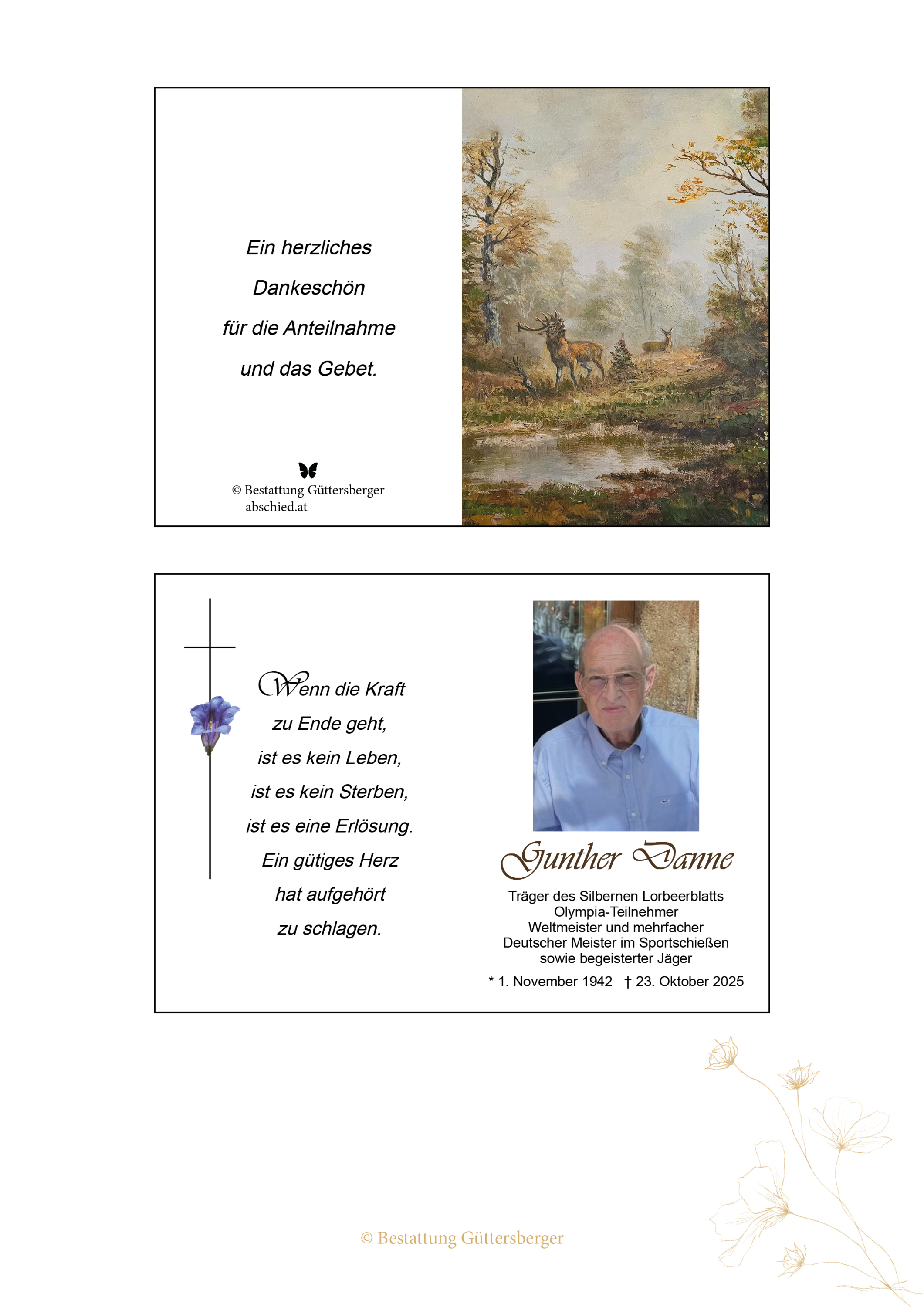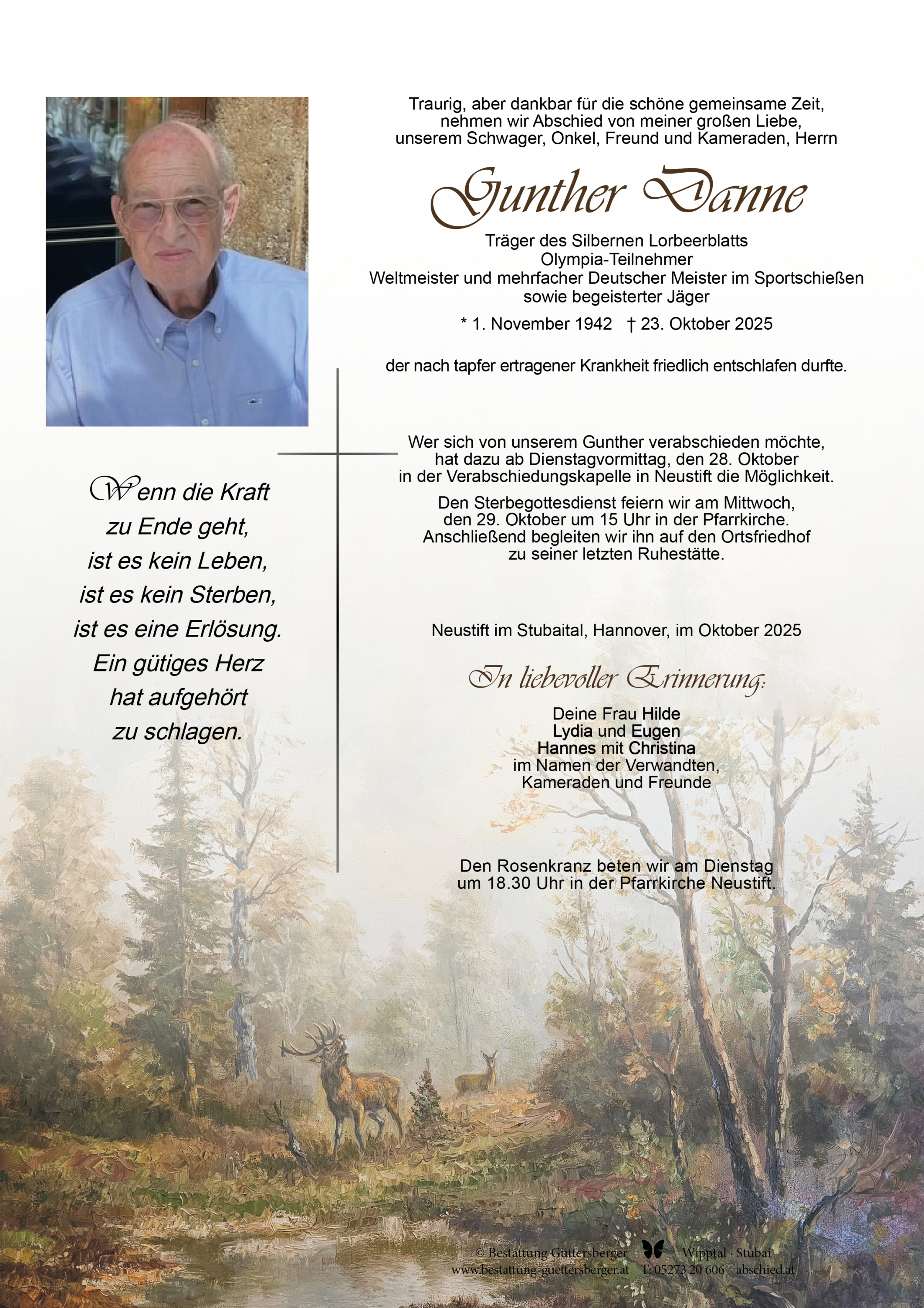 Liebe Hilde ich wünsche dir viel Kraft da dein geliebter Günter die letze Reise angetreten hat! Denk an die schöne Zeit die ihr gehabt habt !!!Traudi