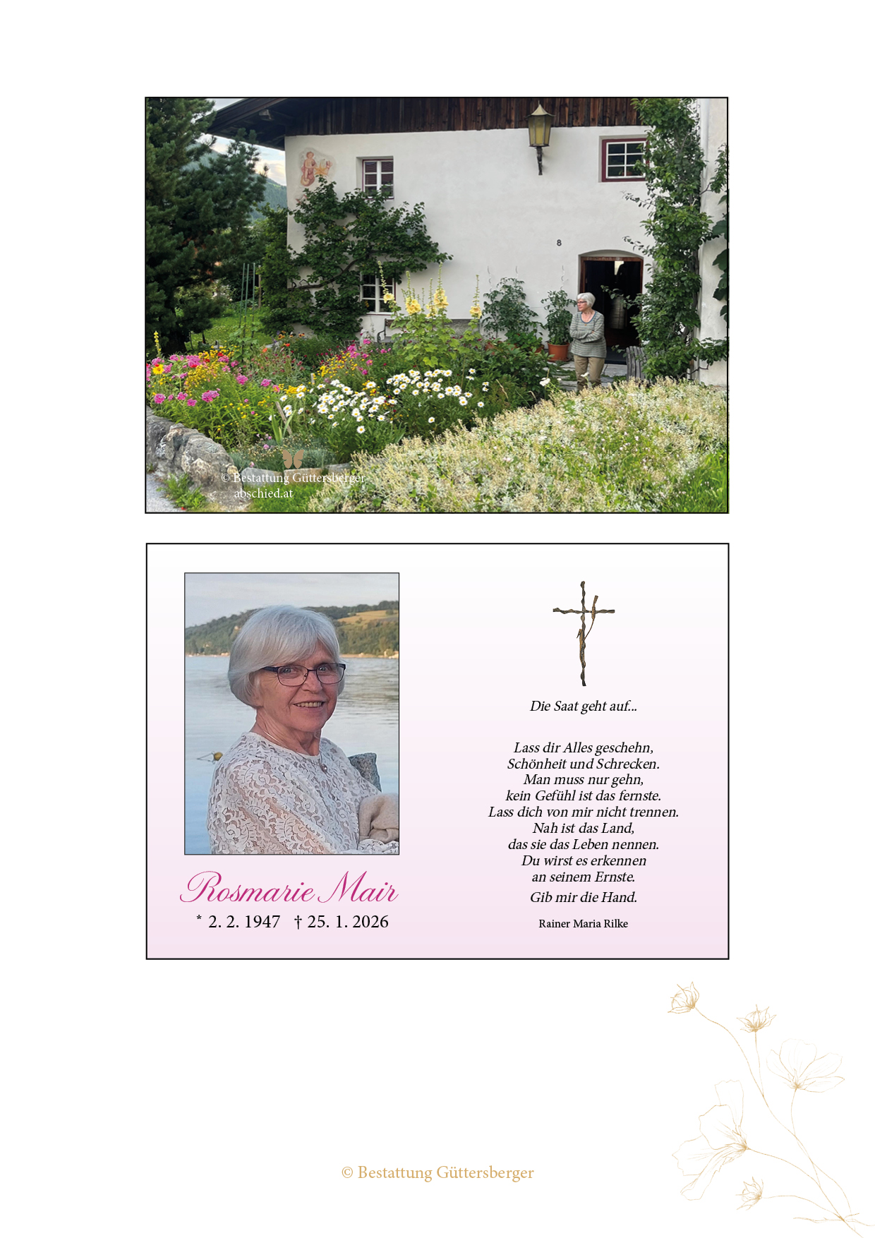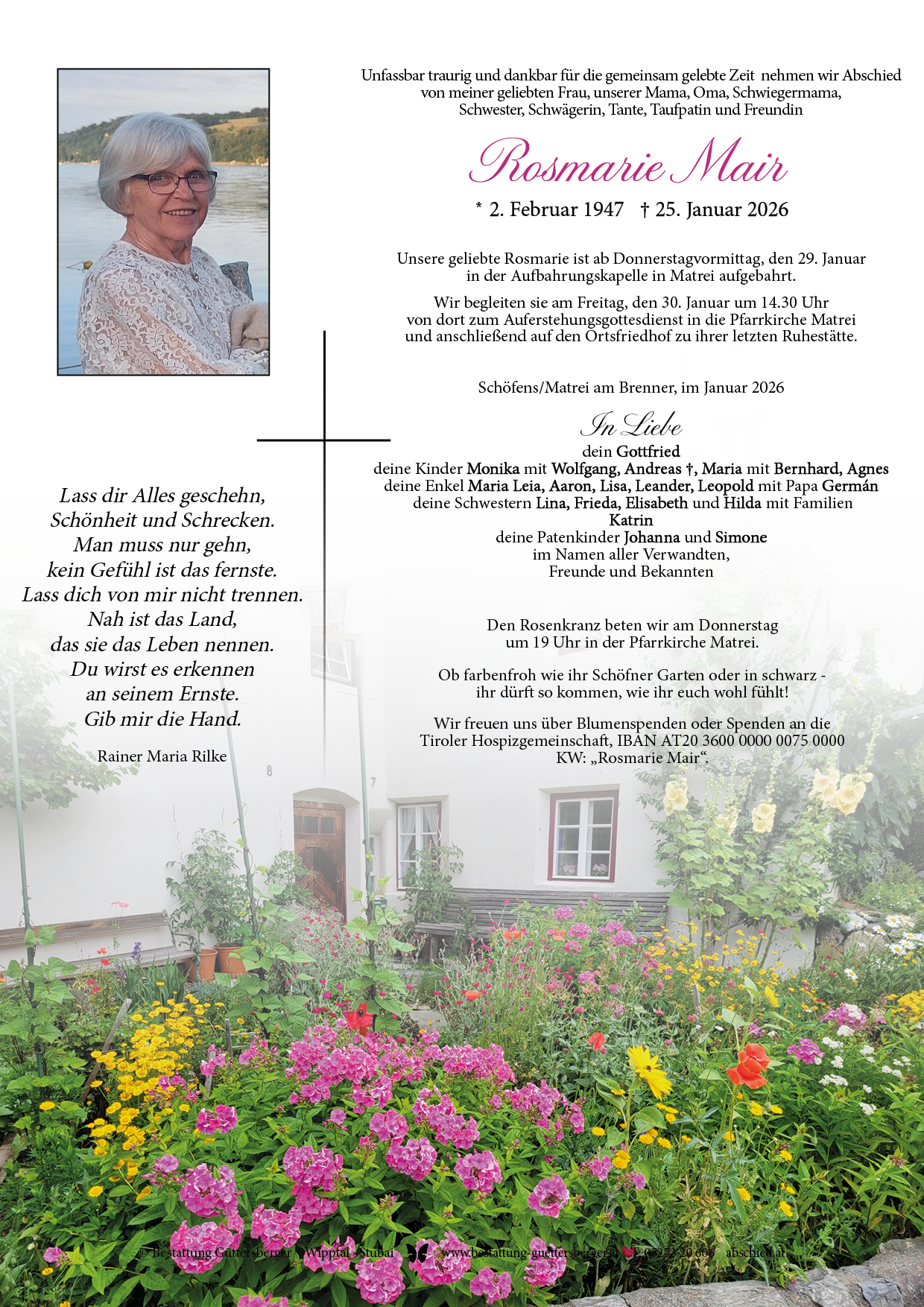 Rosmarie hat immer mit großer Liebe und Begeisterung von euch, ihrer Familie gesprochen. Ihre Familie war für sie ihr Ein und Alles, und das war in jedem Wort spürbar. Für diese schwere Zeit wünsche ich euch von Herzen viel Kraft, Trost und Zusammenhalt. Mögen die vielen liebevollen Erinnerungen an sie euch Halt geben und begleiten.